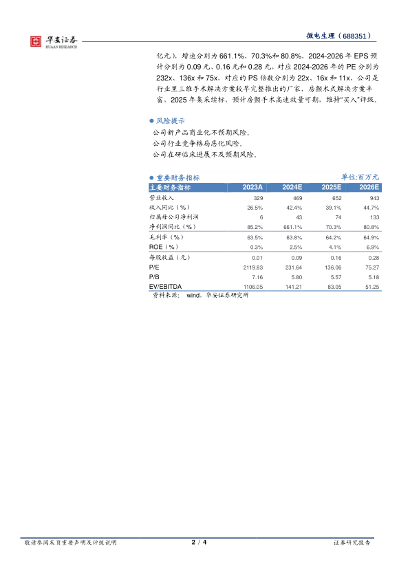 我们预计2024-2026年公司收入分别为4.69亿元、6.52亿元和9.43亿元(前值分别为4.86亿元、6.62亿元和9.51亿元),收入增速分别为42.4%、39.1%和44.7%,2024-2026年归母净利润分别实现0.43亿元、0.74亿元和1.33亿元(前值分别为0.16亿元、0.46亿元和1.01亿元),增速分别为661.1%、70.3%和80.8%,2024-2026年EPS预计分别为0.09元、0.16元和0.28元,对应2024-2026年的PE分别为232x、136x和75x,对应的PS倍数分别为22x、16x和11x,公司是行业里三维手术解决方案较早完整推出的厂家,房颤术式解决方案丰富,2025年集采续标,预计房颤手术高速放量可期,维持“买入”评级。