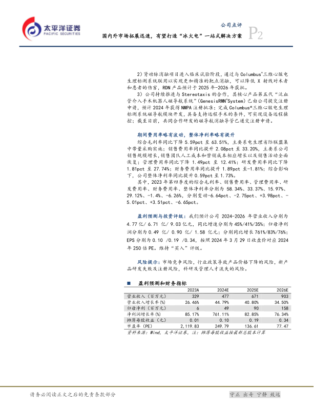 微电生理在2023年通过国内外市场的积极拓展和产品创新,实现了营收和利润的双增长。公司在集采中表现良好,为产品放量奠定基础。同时,公司持续投入研发,特别是在“冰火电”全产品覆盖上取得重要进展。维持“买入”评级,但需关注市场竞争、政策风险以及新产品研发风险。