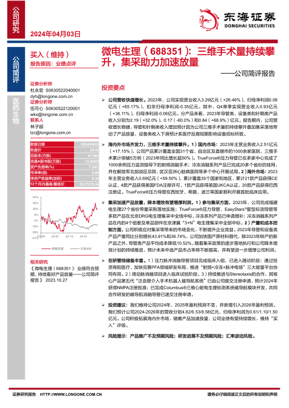 本报告对微电生理的业绩进行了分析,认为公司在营收增长、市场拓展和产品放量方面表现良好。集采政策的落地和公司降本增效的措施有望进一步提高盈利能力。同时,公司在研管线的丰富储备也为未来的发展提供了动力。维持“买入”评级,并预测公司未来几年的营收和净利润将持续增长。