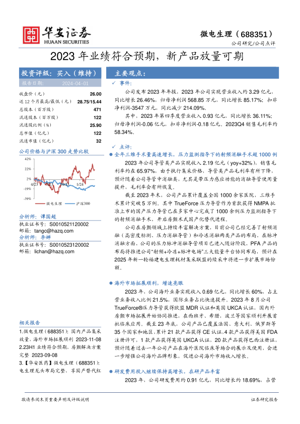 微电生理2023年业绩符合预期,导管类产品和海外市场表现亮眼,研发投入持续增加,在研产品线丰富。华安证券维持“买入”评级,看好公司在房颤领域的未来发展,但同时也提示了新产品商业化、行业竞争和临床进展等方面的风险。