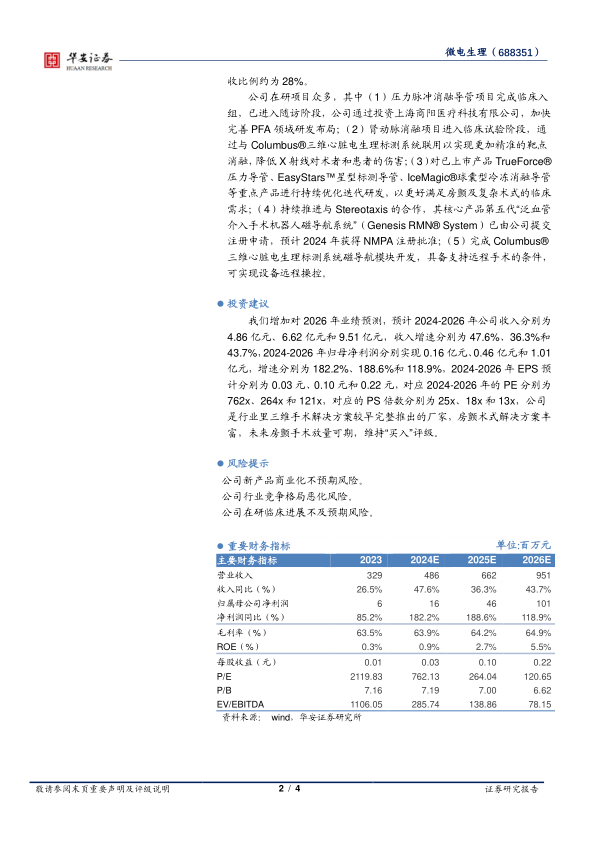 我们增加对2026年业绩预测,预计2024-2026年公司收入分别为4.86亿元、6.62亿元和9.51亿元,收入增速分别为47.6%、36.3%和43.7%,2024-2026年归母净利润分别实现0.16亿元、0.46亿元和1.01亿元,增速分别为182.2%、188.6%和118.9%,2024-2026年EPS预计分别为0.03元、0.10元和0.22元,对应2024-2026年的PE分别为762x、264x和121x,对应的PS倍数分别为25x、18x和13x,公司是行业里三维手术解决方案较早完整推出的厂家,房颤术式解决方案丰富,未来房颤手术放量可期,维持“买入”评级。