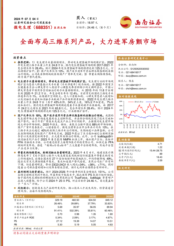 公司凭借其在射频、冷冻消融技术平台的深厚积累,特别是TrueForce压力感知磁定位射频消融导管和IceMagic冷冻消融系列产品的上市,成功进军房颤这一高端治疗领域,填补了国产空白,形成了明显的先发优势。尽管市场对脉冲电场消融(PFA)技术关注度高,但报告认为短期内PFA不会削弱公司射频消融产品的放量,且未来技术融合将是趋势。公司通过降本增效、优化生产流程和加速国产原材料替代,显著提升了盈利能力。预计2024-2026年归母净利润复合增速将达到151%,显示出强劲的增长潜力。鉴于国内纯电生理标的的稀缺性及重磅产品进入放量期,报告首次覆盖给予“买入”评级,目标价24.46元,对应2024年25倍PS。