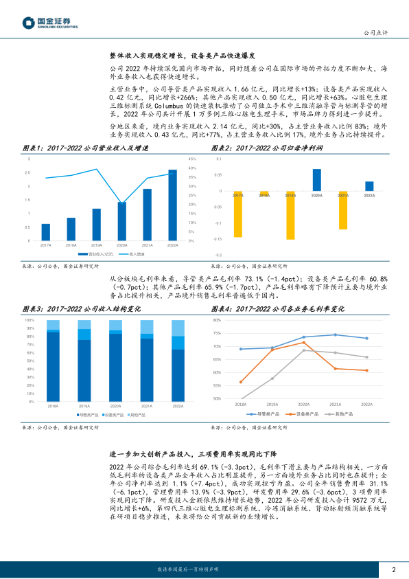 收入实现稳定增长,设备类产品发力明显。公司2022年导管类产品实现收入1.66亿元,同比增长+13%;设备类产品实现收入0.42亿元,同比增长+266%。心脏电生理三维标测系统Columbus的快速装机推动了三维消融导管与标测导管的增长,2022年公司共计开展1万多例三维心脏电生理手术,市场品牌力得到进一步提升。境外业务实现收入0.43亿元,同比+77%,占主营业务收入比例达到17%,海外业务持续发力,占比逐步提升。