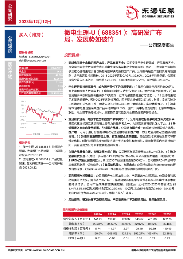盈利预测与投资建议:公司是国产电生理龙头企业,产品覆盖电生理领域。公司设备和耗材媲美外资龙头,拥有多个国产唯一,伴随降价温和的集采政策不断推进和电生理手术量的持续增长,公司产品未来有望快速放量。我们预计公司2023-2025年的营收分别3.44/4.82/6.53亿元,归母净利润为0.29/0.61/1.10亿元,对应EPS分别为0.06/0.13/0.23元,对应PS分别为36.7/26.2/19.3倍。维持“买入”评级。