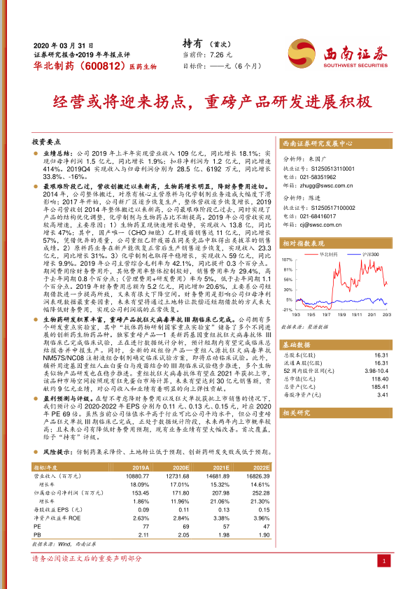 华北制药在经历2014年整体搬迁的阵痛后,于2019年实现了经营上的显著复苏,营收创下搬迁以来新高,标志着公司已走出最艰难时期。生物药业务,特别是重组乙肝疫苗,成为公司业绩增长的核心驱动力。同时,公司在研的1类新药基因重组抗狂犬病毒抗体已完成III期临床,预计短期内将申报生产并有望在2021年上市,该产品拥有巨大的市场潜力,预计可为公司带来30亿元销售额和9亿元净利润,显著提升公司未来的盈利能力。此外,通过土地转让款偿还短期借款以降低财务费用,也将是公司改善盈利水平的重要途径。尽管当前估值高于行业平均,但考虑到重磅创新药的上市预期和财务费用改善空间,公司未来业绩有望大幅提升,因此给予“持有”评级。