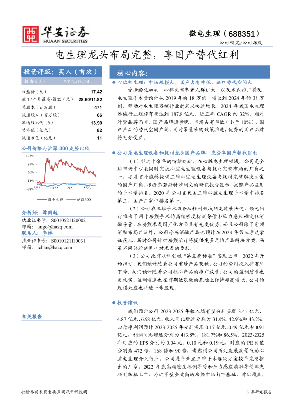 微电生理在2022年实现扭亏为盈,标志着公司进入新的发展阶段。随着重磅产品的陆续获批上市和市场推广的深入,公司预计将迎来核心产品放量带来的规模效应,从而有效降低费用投入,显著提升盈利质量和增速。预计2023-2025年,公司收入和归母净利润将保持超高增长,盈利能力将更加扎实。鉴于公司在心脏电生理介入这一高景气度行业中的国产龙头地位及其技术领先优势,公司展现出显著的投资价值。