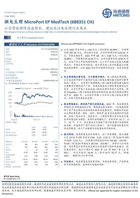 微电生理在2022年实现了营收的显著增长并扭亏为盈,尽管扣非净利润仍为负,但亏损大幅收窄,显示出公司业务发展的积极态势。公司在心脏电生理领域拥有完整的设备与耗材解决方案,并已成功开展逾万例三维心脏电生理手术,市场渗透率稳步提升。2022年的电生理集采政策对国产企业友好,微电生理在此次集采中表现突出,中标19个产品,这将加速其产品入院和国产替代进程。尽管集采导致盈利预测和目标价有所调整,但分析师仍基于行业高景气度和公司的领先地位,维持“优于大市”的评级。未来,公司需关注集采政策、市场竞争、产品渗透率及在研项目风险,以确保持续健康发展。