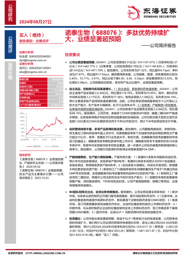 投资建议:公司中报业绩显著超预期,受益于GLP-1等多肽行业的快速发展,公司竞争优势的持续扩大,我们预计公司业绩仍将保持快速增长态势,适当上调公司2024-2026年的盈利预测,预计公司2024-2026年归母净利润分别为4.12/5.61/7.16(原预测:2.26/3.05/3.99)亿元,对应EPS分别为1.88/2.55/3.26(原预测:1.06/1.43/1.87)元,对应PE分别为31.8/23.4/18.3倍。维持“买入”评级。