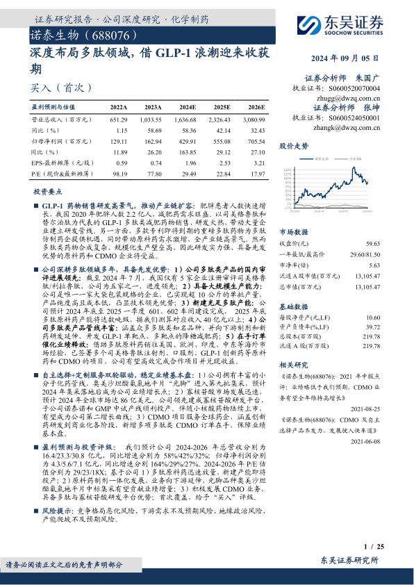 盈利预测与投资评级:我们预计公司2024-2026年总营收分别为16.4/23.3/30.8亿元,同比增速分别为58%/42%/32%;归母净利润分别为4.3/5.6/7.1亿元,同比增速分别164%/29%/27%。2024-2026年P/E估值分别为29/23/18X;基于公司1)多肽原料药迅速放量,新建产能即将投产;2)原料药制剂一体化发展,业务向下游延伸,光脚品种奥美沙坦酯氨氯地平片中标集采有望贡献业绩增量;3)积极发展CDMO业务,具备多肽与寡核苷酸研发平台优势;首次覆盖,给予“买入”评级。