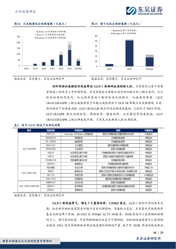 公司深耕多肽领域多年,具备先发优势:1)公司多肽类产品的国内审评进展领先:截至2024年7月,我国仅有5家企业注册审评司美格鲁肽/利拉鲁肽,公司为五家之一,进度领先;2)具备大规模生产能力:公司是唯一一家大袋包装规格的企业,已实现超10公斤的单批产量,产品纯度高且成本低,凸显技术领先优势;3)新建充足多肽产能:公司预计2024年底至2025一季度601、602车间建设完成,2025年底多肽原料药产能将达数吨级,据我们测算对应收入40亿元以上;4)公司多肽类产品管线丰富:涵盖众多多肽类知名品种,并向下游制剂和新药研发延伸,开发GLP-1单靶点、多靶点的降糖减肥药;5)在手订单催化业绩释放:借助多肽原料药销往美国、欧洲、印度、中东等海外市场经验,已签署多个司美格鲁肽注射剂、口服剂、GLP-1创新药等原料药和CDMO的项目,公司有望高效完成合作项目并兑现收益。