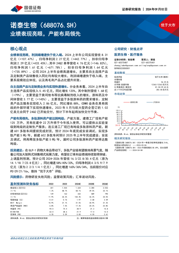 投资建议:在GLP-1药物大单品带动下,多肽产业链有望维持高景气度,随着公司加大矩阵式销售模式拓展力度,有望在订单和业绩端持续取得突破。上调盈利预测,预计公司2024-2026年营收16.3/22.8/30.4亿元(原为14.1/18.7/23.8亿元),同比增速58%/40%/33%,归母净利润4.3/5.9/7.9亿元(原为2.2/3.1/4.1亿元),同比增速165%/36%/34%,当前股价对应PE=29/21/16x,维持“优于大市”评级。