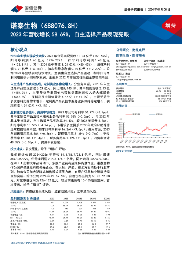我们预计公司2024-2026年营收14.1/18.7/23.8亿元,同比增速36%/33%/27%,归母净利润2.2/3.1/4.1亿元,同比增速35%/40%/33%。在GLP-1药物大单品带动下,多肽产业链有望维持高景气度。诺泰生物作为国产多肽原料药领先企业,在人员、产能、技术方面均处于行业前列,随着公司加大矩阵式销售模式拓展力度,有望在订单和业绩端持续取得突破。给予公司2024年PE57-60x,合理价格区间为58.98-62.08元,对应市值区间为126-132亿元,较当前股价有10-16%溢价空间,首次覆盖,给予“增持”评级。