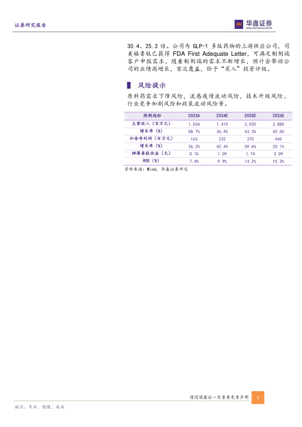 预测公司2024-2026年收入分别为14.10、20.20、28.80亿元,归母净利润分别为2.32、3.70、4.45亿元,EPS分别为1.09、1.74、2.09元,当前股价对应PE分别为48.6、30.4、25.3倍。公司为GLP-1多肽药物的上游供应公司,司美格鲁肽已获得FDA First Adequate Letter,可满足制剂端客户申报需求,随着制剂端的需求不断增长,预计会带动公司的业绩高增长,首次覆盖,给予“买入”投资评级。