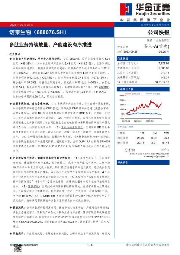 投资建议:公司多肽原料药深度布局,拥有多核心技术平台,产能建设有序推进;多肽业务持续增长,定制类产品及技术服务业务逐步企稳,寡核苷酸优势板块有望带来新的业绩增长点。我们预测公司2023-2025年归母净利润1.37/1.82/2.47亿元,增速5.8%/33.0%/36.2%,对应PE分别为57/43/31倍。首次覆盖,给予“买入-A”建议。