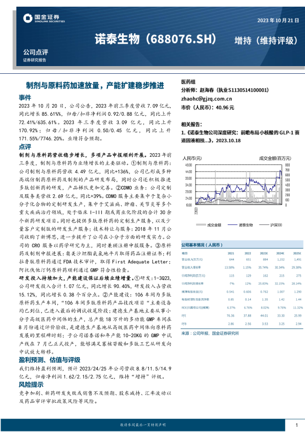 本报告分析了公司2023年前三季度的财务业绩,指出制剂与原料药业务是主要的增长驱动力,CDMO业务稳步发展。公司持续加大研发投入和产能建设,为未来业绩增长奠定基础。维持对公司未来营收和净利润的盈利预测,并维持“增持”评级,同时提示了相关风险。