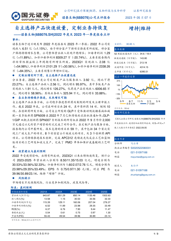 本报告对诺泰生物(688076.SH)2022年度报告及2023年一季报进行了点评,核心观点如下: