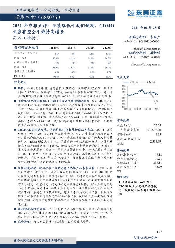 本报告分析了诺泰生物2021年中报,指出公司业绩略低于预期,但CDMO业务仍是主要增长动力。