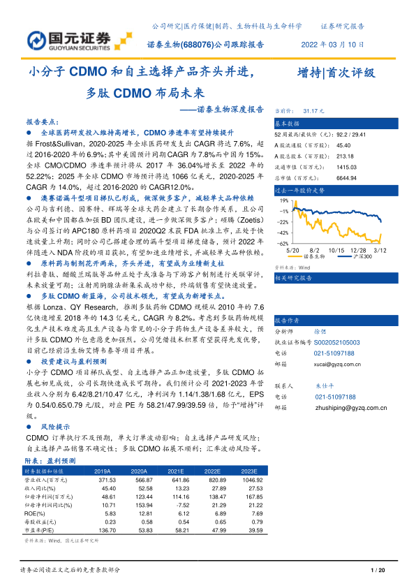 小分子CDMO项目梯队成型、自主选择产品正加速放量,多肽CDMO拓展也初见成效,公司长期快速成长可期待。我们预计公司2021-2023年营业收入分别为6.42/8.21/10.47亿元,净利润为1.14/1.38/1.68亿元,EPS为0.54/0.65/0.79元/股,对应PE为58.21/47.99/39.59倍,给予“增持”评级。