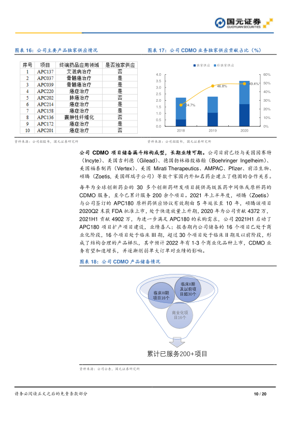 公司与吉利德、因赛特、辉瑞等全球大药企建立了长期合作关系,且公司在欧美和中国都在加强BD团队建设,进一步做深做多客户;硕腾(Zoetis)与公司签订的APC180原料药项目2020Q2末获FDA批准上市,正处于快速放量上升期;同时公司已搭建合理的漏斗型项目梯度储备,预计2022年伴随进入NDA阶段的项目获批,有望加速业绩增长,并减轻单大品种依赖。