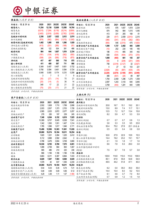2022年上半年,海正药业实现营业收入57.37亿元,同比减少4.46%。然而,公司通过精细化管理,有效控制成本费用并提升运营周转效率,使得归属于上市公司股东的净利润达到3.19亿元,同比增长13.88%;扣除非经常性损益后的归母净利润为1.88亿元,同比增长19.32%。经营性现金流持续增长,有息负债规模有效降低,融资相关财务费用同比下降,整体财务状况保持健康。预计随着国内疫情的逐步缓解,公司下半年业绩将加速提升。
