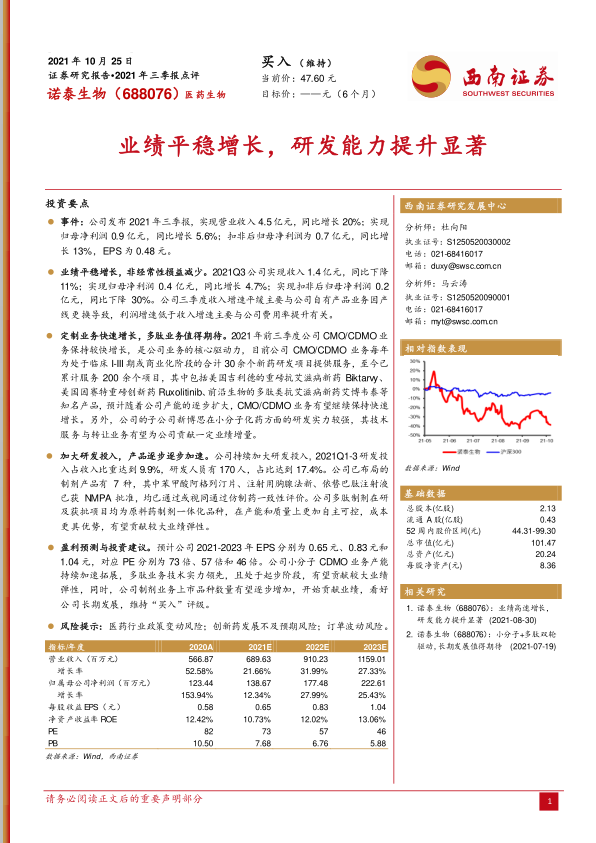 本报告对诺泰生物2021年三季报进行了全面分析,指出公司业绩平稳增长,研发能力提升显著。CMO/CDMO业务快速增长是核心驱动力,同时制剂产品逐步加速。公司持续加大研发投入,看好公司长期发展,维持“买入”评级。但同时也提示了医药行业政策变动、创新药发展不及预期以及订单波动等风险。