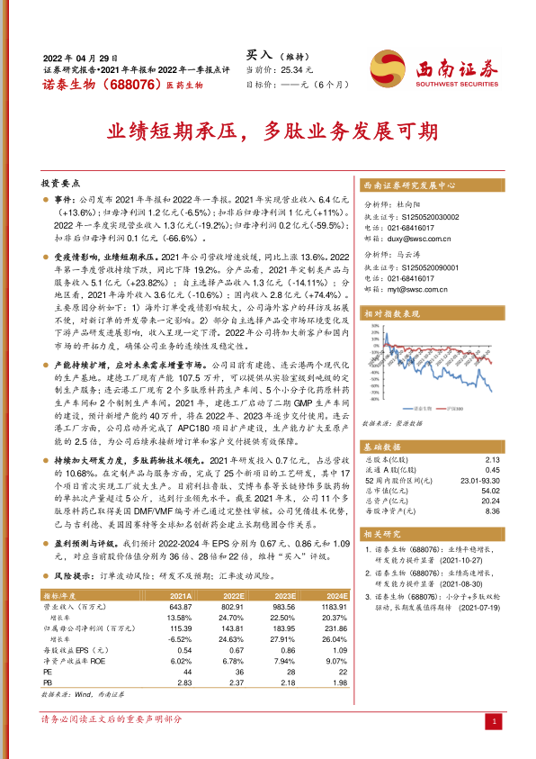 本报告对诺泰生物2021年年报和2022年一季报进行了分析,指出公司业绩短期受到疫情影响,但通过加大新客户和国内市场的开拓力度,确保公司业务的连续性及稳定性。公司在产能扩张和研发投入方面持续加大力度,尤其在多肽药物技术方面处于领先地位,与多家全球知名创新药企建立了长期合作关系。基于对公司未来盈利的预测,维持“买入”评级。同时,报告也提示了订单波动、研发不及预期和汇率波动等风险。