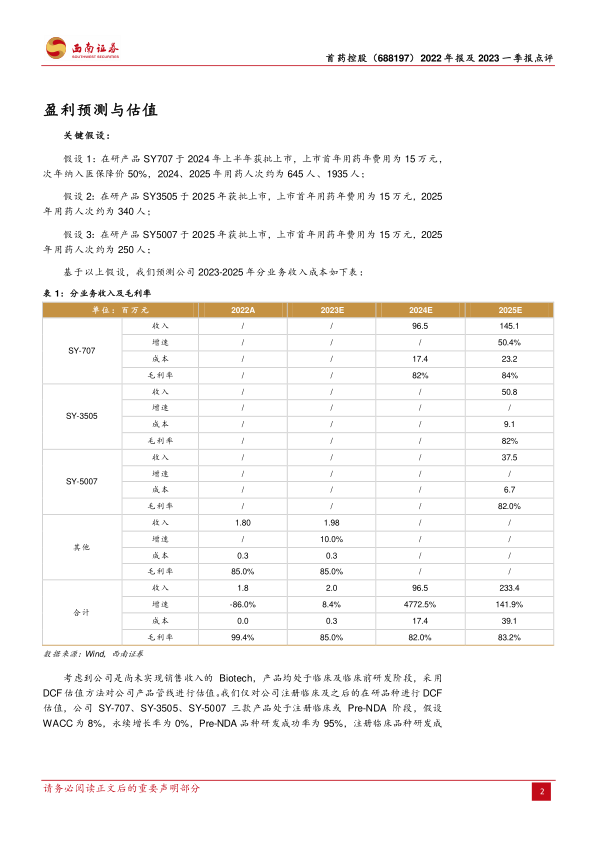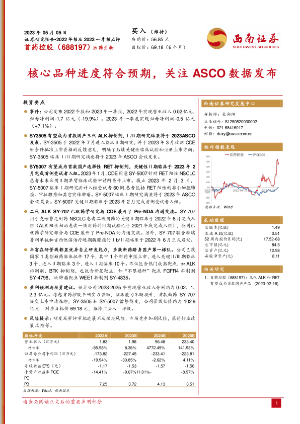 盈利预测与投资建议。预计公司2023-2025年实现营业收入分别约为0.02、1、2.3亿元。考虑首药控股早研实力强劲,临床能力不断提升,首款新药SY-707提交上市申请在即,SY-3505和SY-5007蓄势待发,公司管线估值约为102.9亿元,对应目标价69.18元,维持“买入”评级。