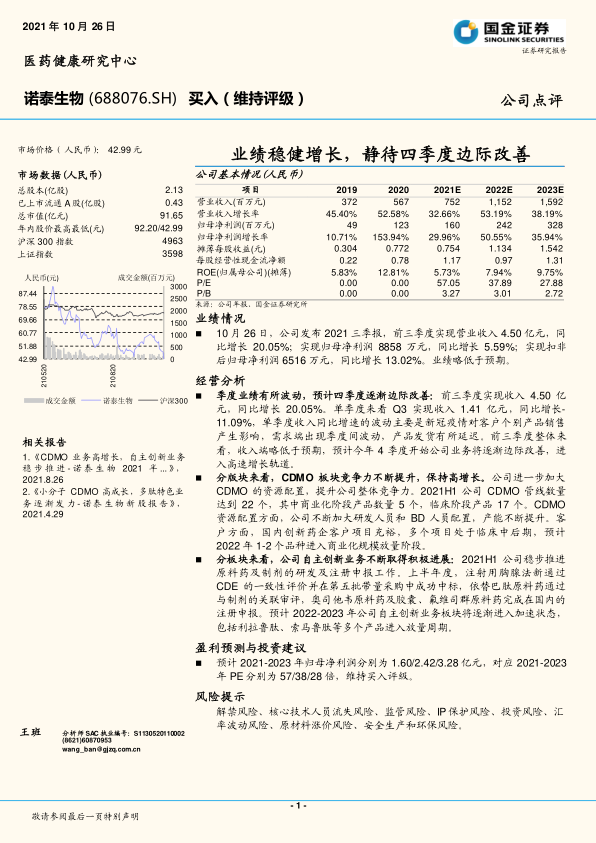 本报告分析了诺泰生物(688076.SH)2021年三季报,指出公司前三季度业绩略低于预期,但CDMO业务保持高增长,自主创新业务稳步推进。预计四季度公司业务将逐渐边际改善,进入高速增长轨道。
