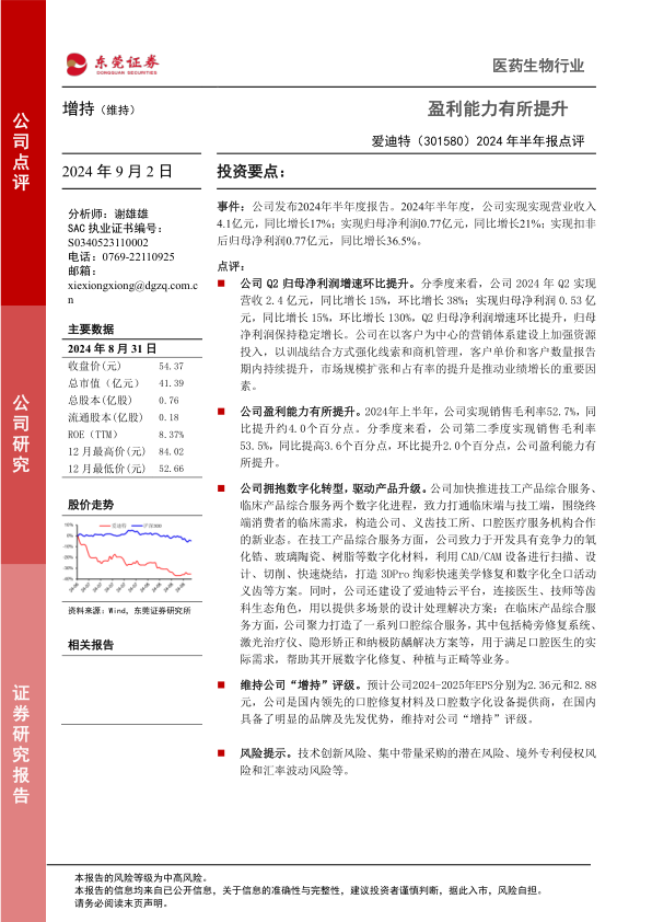 本报告对爱迪特2024年半年报进行了全面分析,公司在营收和利润方面均实现了稳健增长,盈利能力显著提升。数字化转型战略的推进,有望进一步巩固其市场地位。维持“增持”评级,但需关注技术创新、集中带量采购、境外专利侵权和汇率波动等风险。