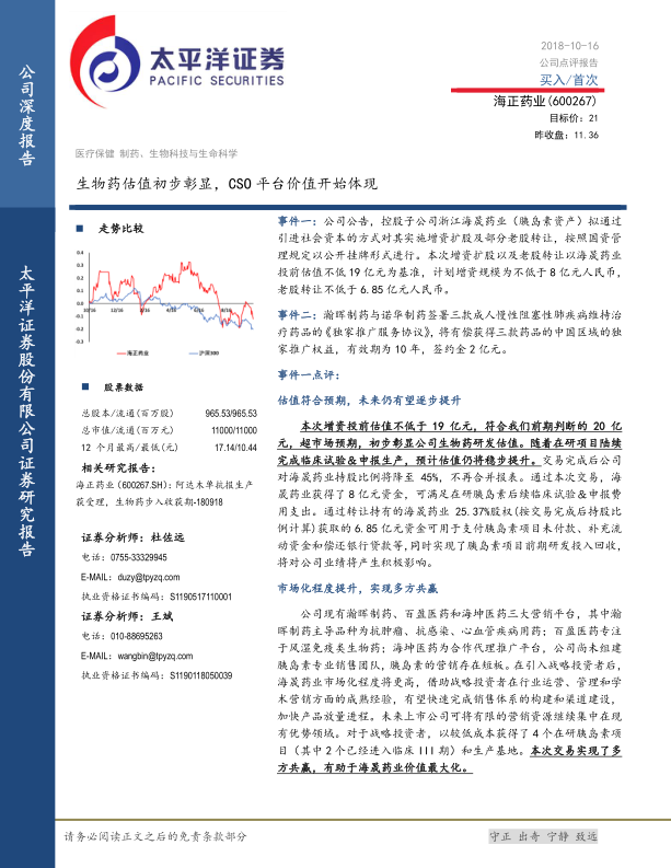公司正迎来业务和管理上的历史性拐点。高瓴资本的进入有效优化了管理,驱动瀚晖制药利润快速增长,2018年上半年利润增长超过40%。生物药板块价值被严重低估,随着阿达木单抗申报生产及其他单抗产品进入临床III期,其估值有望逐步兑现。此外,化学创新药海泽麦布进展良好,仿制药业务受益于国家集采政策,以及定增完成后管理体系的理顺和激励机制的完善,共同构成了公司未来业绩持续增长的强劲驱动力。基于此,报告维持“买入”评级,并预计公司2019年合理市值可达250-300亿元,保守估值200亿元以上。
