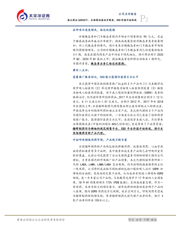 瀚晖制药与诺华制药签署了为期10年的《独家推广服务协议》,将有偿获得三款成人慢性阻塞性肺疾病(COPD)维持治疗药品的中国区域独家推广权益,签约金为2亿元。这三款产品分别为马来酸茚达特罗吸入粉雾剂、茚达特罗格隆溴铵吸入粉雾剂用胶囊和格隆溴铵吸入粉雾剂用胶囊,均为诺华原研创新药品。2017年,这三款产品全球销售额分别达到1.12亿美元、4.11亿美元和1.51亿美元,并已于2012年、2017年和2018年陆续在国内上市。此次合作不仅显示出瀚晖制药已具备创新药营销推广能力,获得国际医药巨头的认可,也进一步体现了其作为稀缺规范销售平台的CSO价值。在高瓴资本进入后,瀚晖制药业绩持续改善,2018年上半年利润增长40%,预计未来将陆续代理更多新产品。