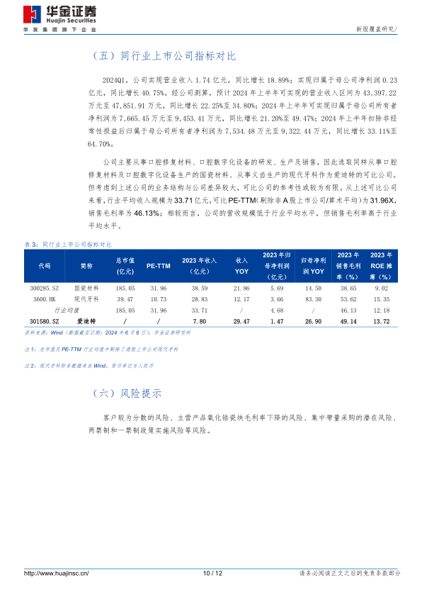 投资亮点:1、公司是国内最大的义齿用氧化锆瓷块生产企业之一,为国内口腔材料龙头企业。公司设立以来持续深耕氧化锆瓷块等口腔修复材料,是国内较早进入该领域的企业,目前已成长为国内最大的义齿用氧化锆瓷块生产企业之一,根据公司招股书中披露,公司2020年氧化锆口腔修复材料的国内市占率约为6.21%,在该领域高端产品线上跻身国际领先前列、并实现进口替代。除氧化锆瓷块外,公司还陆续拓展玻璃陶瓷、树脂等口腔修复材料,在业内已形成较好的品牌知名度,为CN10/CNPP数据研究及十大品牌网联合推出的十大牙冠材料品牌榜的唯二两家本土牙冠品牌之一,2023年收入规模位列本土四大口腔材料企业之首。2、顺应客户需求,公司成功开拓了口腔数字化设备并成长为第二大业务。在持续优化口腔修复材料产品的过程中,公司发现了客户对可实现数字化精密加工、提高义齿制造效率的齿科设备的相关需求,2018年公司顺应行业数字化趋势及客户需求,推出口腔数字化设备服务,通过将设备产品与口腔修复材料整合或对设备类产品进行适配性集成,更好地服务技工端客户及临床端客户。报告期内,通过挖掘口腔材料已有客户的设备需求,公司设备类产品实现快速发展;2020-2022年公司设备与材料重叠客户数量占设备客户总数均达到75%以上、重叠客户采购金额占设备销售金额比例维持在90%左右;口腔数字化设备销售金额从2020年的0.93亿元增长至2023年的2.04亿元,CAGR达到30%,2023年设备销售占比已达到26.15%,成为公司第二大业务。3、2023年以来,公司持续通过并购实现业务外延式发展,目前已切入口腔种植材料及上游氧化锆粉体领域。1)韩国沃兰为一家种植体供应商,产品已取得FDA/CE/CFDA/KFDA等多个地区的注册证。为延伸在口腔医疗器械产业布局,公司于2023年12月、2024年1月,公司分别收购了韩国沃兰34.36%、33.50%股份,目前合计持有其67.87%的股份,成为其控股股东。2)景德镇万微专业从事氧化锆粉体生产,为保障供应链稳定,公司于2023年10月通过参股景德镇万微切入上游氧化锆粉体业务。参股当年,景德镇万微进入公司氧化锆原料的前五大供应商并实现供货3221.69万元,氧化锆粉原料采购均价从2022年的200元/千克下降至2023年的184元/千克,较好地提升了成本竞争力。