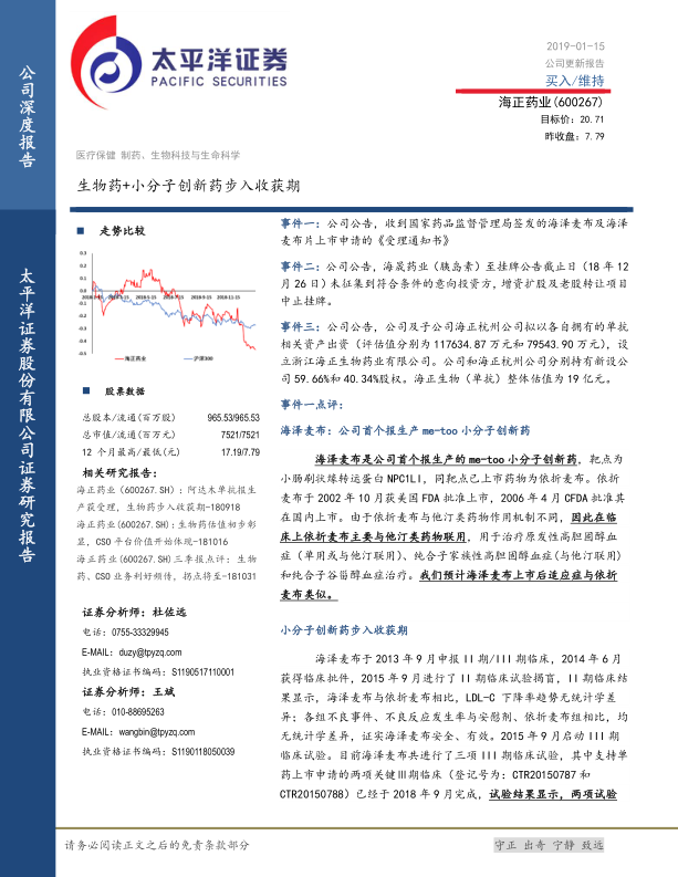 海正药业正处于管理和经营双重历史拐点,小分子创新药海泽麦布的申报生产、单抗资产的整合以及胰岛素业务的持续推进,共同构筑了公司未来增长的核心驱动力。尽管胰岛素资产流拍,但其内在价值仍被认可,后续引入战投值得期待。公司通过聚焦主业、优化管理和激励机制,有望实现业绩的逐步释放和估值的重塑。太平洋证券维持“买入”评级,并认为公司目前75亿市值严重低估,2019年合理估值可达200亿元。然而,国家集采政策、管理层理顺情况、固定资产折旧及财务费用压力、以及药品获批上市的不确定性仍是需要关注的风险因素。