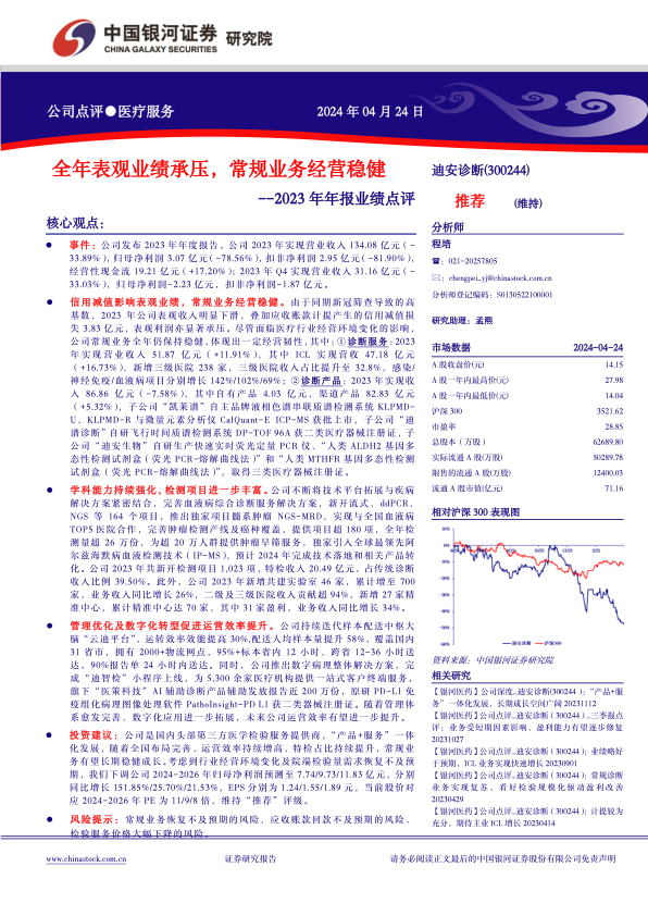 本报告对迪安诊断(300244)2023年年报业绩进行了点评,维持“推荐”评级。核心观点如下: