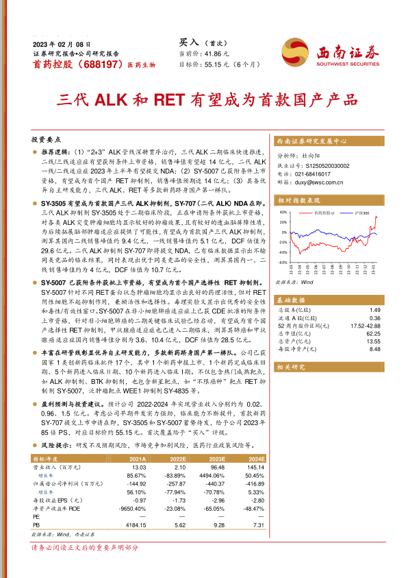 盈利预测与投资建议。预计公司2022-2024年实现营业收入分别约为0.02、0.96、1.5亿元。考虑公司早期开发实力强劲,临床能力不断提升,首款新药SY-707提交上市申请在即,SY-3505和SY-5007蓄势待发,给予公司2023年85倍PS,对应目标价约55.15元。首次覆盖给予“买入”评级。