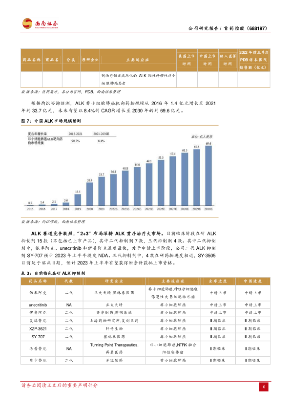 根据灼识咨询预测,中国ALK非小细胞肺癌靶向药物市场规模从2016年的1.4亿元增长至2021年的约33.7亿元,预计到2030年将以8.4%的CAGR增长至约69.6亿元。目前临床阶段在研ALK抑制剂有15款,竞争激烈。首药控股的“2+3”布局旨在深耕ALK贯序治疗大市场。
