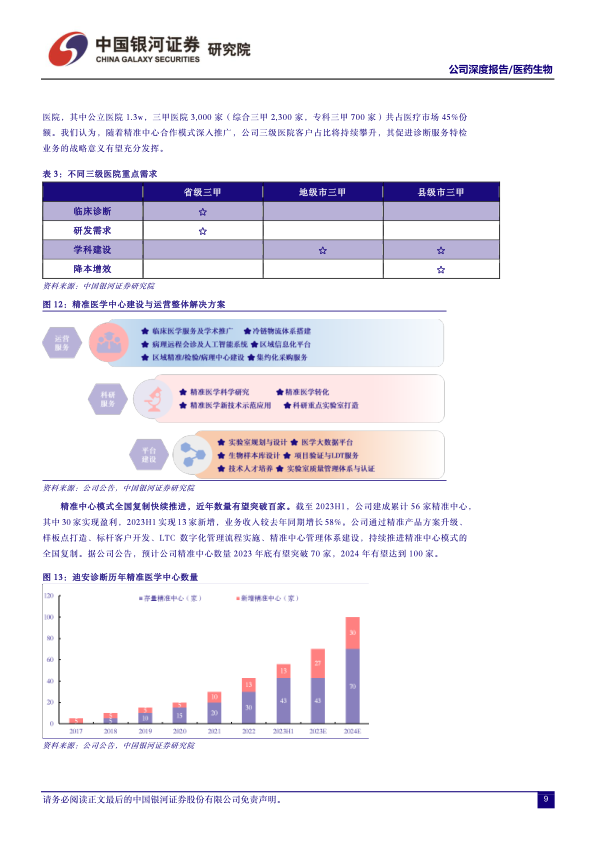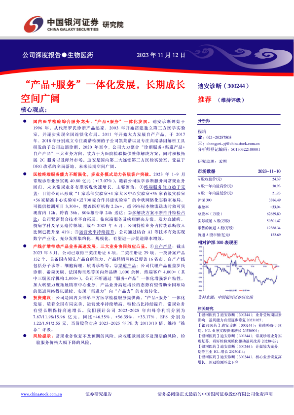 本报告通过对迪安诊断的深度分析,认为公司在“产品+服务”一体化发展战略下,凭借不断强化的医检终端服务能力、日益精进的学科能力和持续推进的数字化产业化,有望在医学诊断领域实现长期增长。同时,公司积极布局自产产品和海外市场,有望进一步拓展发展空间。