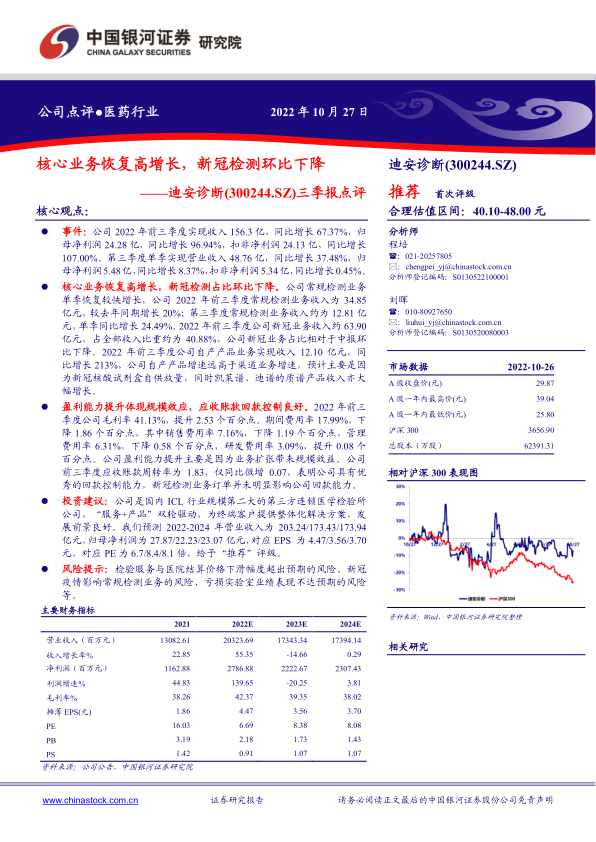 迪安诊断在2022年前三季度表现出色,核心业务稳健增长,新冠检测业务占比下降,盈利能力有所提升。公司作为第三方医学检验行业的领先者,未来发展潜力巨大。维持“推荐”评级,但需关注相关风险因素。