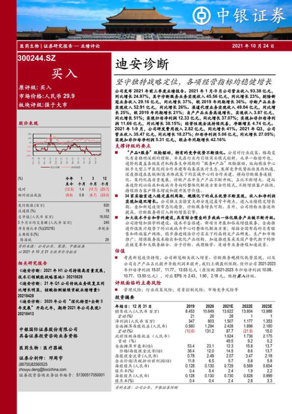 公司发布2021年前三季度业绩报告。2021年1月-9月公司营业收入93.38亿元,同比增长24.97%,其中诊断服务业务实现收入45.56亿元,同比增长23%,剔除新冠业务收入29.16亿元,同比增长37%,较2019年同期增长36%。诊断产品业务实现收入52.91亿元,同比增长26%。渠道代理业务实现收入49.04亿元,同比增长25%,较2019年同期增长21%;自产产品业务高速增长,实现收入3.87亿元,同比增长51%;实现归母净利润12.33亿元,同比增长37.07%;实现扣非归母净利润11.66亿元,同比增长38.15%;经营性现金流持续改善,净额增至4.74亿元,2021年1-9月,公司研发费用投入2.82亿元,同比增长41%。2021年Q3,公司营业收入35.47亿元,同比增长18.27%;归母净利润5.06亿元,同比增长27.05%;实现扣非归母净利润5.31亿元,较去年同期增长42.16%