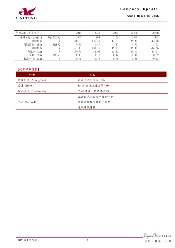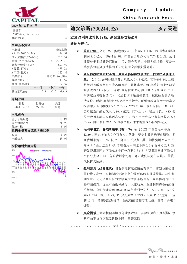 盈利预测与投资建议: 目前多地新冠疫情的背景下, 新冠核酸检测量仍维持高位,短期新冠检测业务仍将贡献较多业绩增量。 从中长期来看, 公司诊断服务的规模效应的将不断体现, 高端检测占比也将不断提升,自主产品也将成为一大驱动力, 主业利润将会持续保持增长。 我们预计公司 2022/2023 年净利分别为 16.9 亿元/14.4 亿元, YOY+45.6%/-14.7%,EPS 分别为 2.7 元和 2.3 元,PE 分别为 10 倍和 12 倍,考虑到短期疫情下新冠核酸检测需求旺盛,维持“买进”评级。
