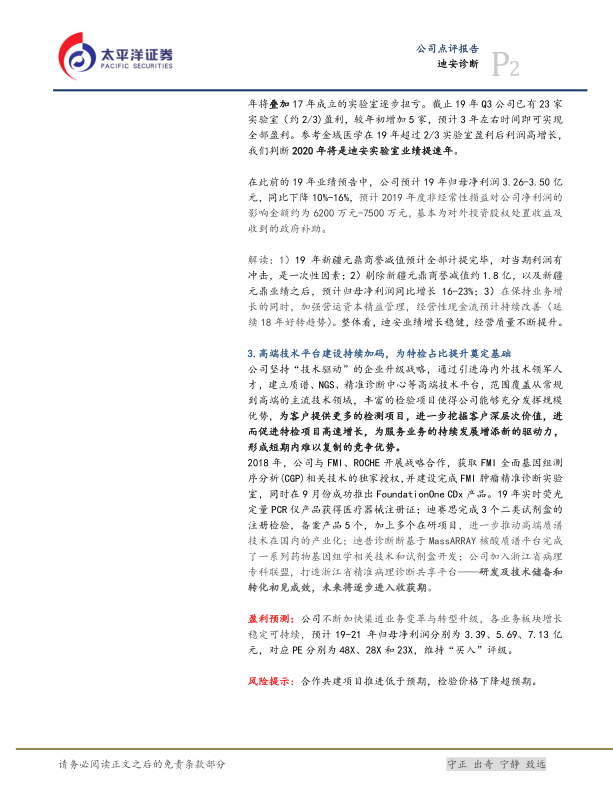 本报告分析了迪安诊断引进投资者增资凯莱谱并启动分拆上市的事件,认为此举将激发凯莱谱活力,提升迪安诊断竞争力。同时,报告指出迪安诊断的医学实验室逐步进入盈利期,业绩有望提速,且公司坚持“技术驱动”战略,通过建设高端技术平台,为特检项目高速增长奠定基础。维持“买入”评级。
