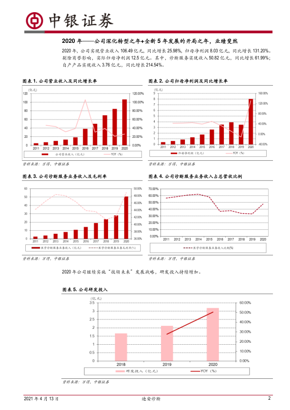 公司2020年实现总营业收入106.49亿元,同比增长25.98%;剔除商誉影响,实际归母净利润12.5亿元。其中,诊断服务实现收入50.82亿元,同比增长61.99%;自产产品实现收入3.76亿元,同比增长214.54%。公司经营净现金流15.47亿,同比增长220.29%;2020年公司“深化转型+全新5年发展”的开局之年,2021年公司将聚焦五大任务计提商誉减值后轻装上阵,期待2021年公司表现。维持买入评级。
