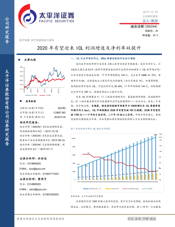 本报告对迪安诊断(300244)维持“买入”评级,并设定目标价35元,认为其当前市值被低估,预计2020年有近50%的上涨空间。核心驱动因素在于独立医学实验室(ICL)行业巨大的市场增长潜力,以及公司自身实验室盈利能力的显著提升和高端技术平台的持续加码。