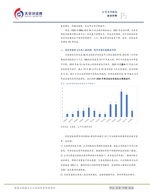 实验室板块明年利润增速和净利率双提升,除了行业因素和新建实验室减亏,还包括多方面因素:1)公司服务业务拥有渠道优势,客户多为三级医院,为后续开拓特检业务和搭建精准诊断平台奠定良好基础;2)通过学术推广和精准诊断平台,将提升存量客户的业务量,特别是毛利率普遍在50%以上的特检业务;3)实验室普检业务投入成本相对固定,检验量提升后净利率将逐步提升;4)随着实验室逐步盈利和技术平台搭建完成,资本性支出预计将稳步减少;5)合作共建业务已拓展400多家医疗机构,随着公司对质量和检验量的重视,整体盈亏周期将缩短;6)原罗氏大中华区总裁黄柏兴先生加盟迪安任总经理,其丰富的管理经验将为公司业务发展提供坚实保障。