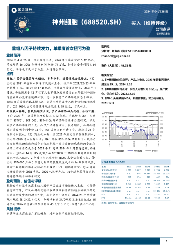 本报告分析了神州细胞2024年一季度业绩,指出公司营收大幅增长并首次实现单季度扭亏为盈,主要得益于重组八因子产品安佳因的强劲增长。公司持续投入研发,多个管线产品陆续进入商业化阶段,为未来发展提供动力。尽管考虑到集采降价和研发费用增长的因素,下调了公司未来几年的营收和利润预期,但仍维持“买入”评级。