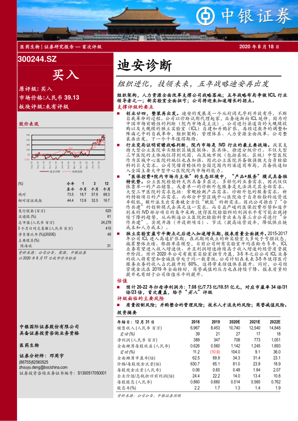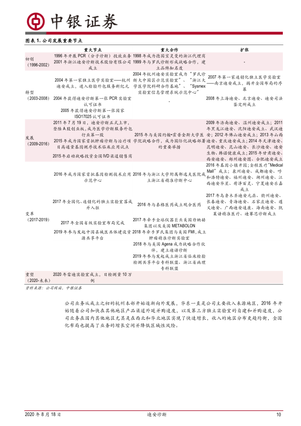 迪安诊断自1996年创业以来,经历了从诊断试剂代理到ICL业务延伸的多次自我革命。公司以对中国市场前瞻性的判断为基础,大规模收购渠道商并自建、并购独立实验室,奠定了“产品+服务”一体化战略的基础。在数年的调整和阵痛后,公司于2019年进行了组织架构、管理体系和人力资源的全面改革,引入了经验丰富的职业经理人黄柏兴担任CEO/CTO,并由技术专家姜傥担任高级副总裁,旨在实现扁平化管理和更快的市场响应。公司新的五年战略规划将学科建设和技术平台打造置于战略制高点,将业务模式调整为“产品业务”、“普检业务”和“特检业务”三大板块,并提出普检平稳发展、特检加大投入、To C业务积极开展的三条增长曲线。为保障战略落地,公司在销售力、技术力和组织融合方面持续投入,例如围绕“肿瘤、妇幼、感染、慢病”打造专业临床市场部,并重点建设串联质谱、核酸质谱、NGS等国际顶尖技术平台。2020年限制性股票激励计划的推出,进一步彰显了管理层对公司未来业绩增长的信心。