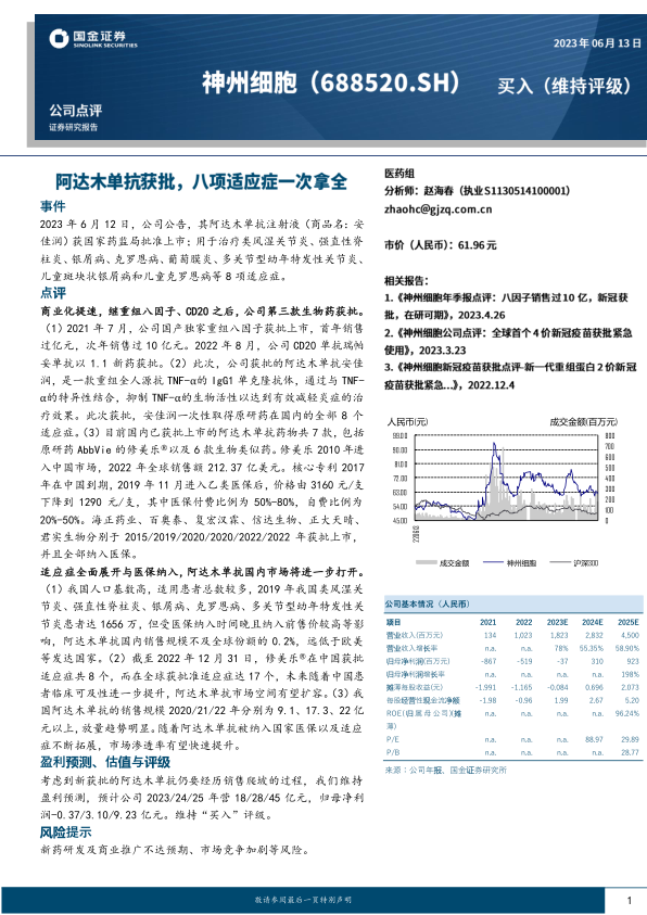 2023 年 6 月 12 日,神州细胞公告其阿达木单抗注射液(安佳润)获国家药监局批准上市,用于治疗包括类风湿关节炎、强直性脊柱炎、银屑病、克罗恩病、葡萄膜炎、多关节型幼年特发性关节炎、儿童斑块状银屑病和儿童克罗恩病等 8 项适应症。