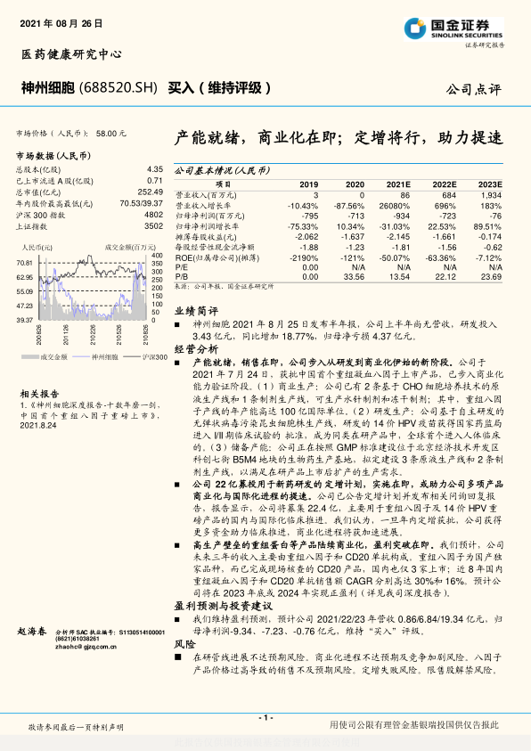 神州细胞 2021 年 8 月 25 日发布半年报,公司上半年尚无营收,研发投入3.43 亿元,同比增加 18.77%,归母净亏损 4.37 亿元。