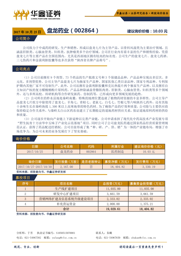 新股询价报告:盘龙药业