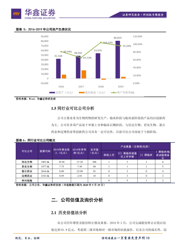 公司的产品处于研发阶段尚未实现商业化,生物药研发业务尚未产生营业收入。 2016年公司营业收入来自于科研试剂和研发外包业务;自2016年12月分立将业务剥 离至义翘科技后,公司不再从事科研试剂和研发外包业务,近三年公司的营业收入来 自于资产租赁及代关联方发货收入。2017、2018和2019年公司归母净利润分别为-1.41 亿元、-4.53亿元和-7.95亿元。近年来公司研发费用逐年增长,2019年研发费用为 5.16亿元。2019年公司总资产为8.08亿元,资本负债率为95.69%。